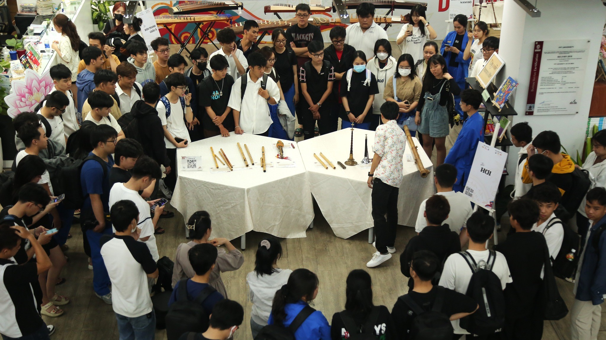 In 2024, the “Melodies of the Nation” Exhibition attracted more than 100 participating students and featured two main activities: an exhibition displaying over 100 traditional musical instruments and a special seminar dedicated to the monochord (dan bau). During the seminar, two renowned artists, Mr. Toan Thang and Mr. Ha Chuong, shared profound insights into the history, performance techniques, and contemporary development of the dan bau in modern Vietnamese music.