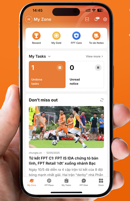 All work operations are accessible through the integrated mobile app My FPT Next, allowing employees to manage tasks directly from their personal devices.