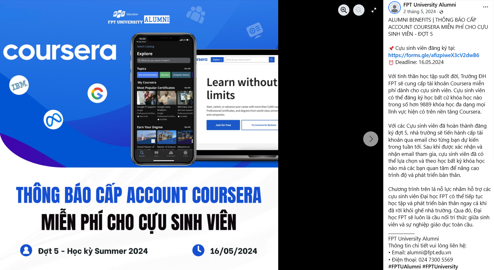 FPT University signed an MOU with Coursera to design the most suitable learning package for both internal and external learners in Vietnam. Since 2022, the university has offered thousands of free Coursera accounts for its alumni, enabling them to continue lifelong learning immediately after graduation.