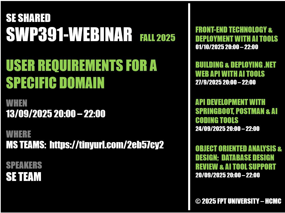Bộ môn SE thân mời các bạn sinh viên đang học môn SWP391 ghé tham dự chuỗi chia sẻ online để cùng gặp gỡ các Thầy Cô đang trực tiếp dạy môn SWP391 và các diễn giả khách mời nhằm giúp các bạn củng cố kiến thức, thực hiện dự án hoàn thiện, chỉnh chu nhất.