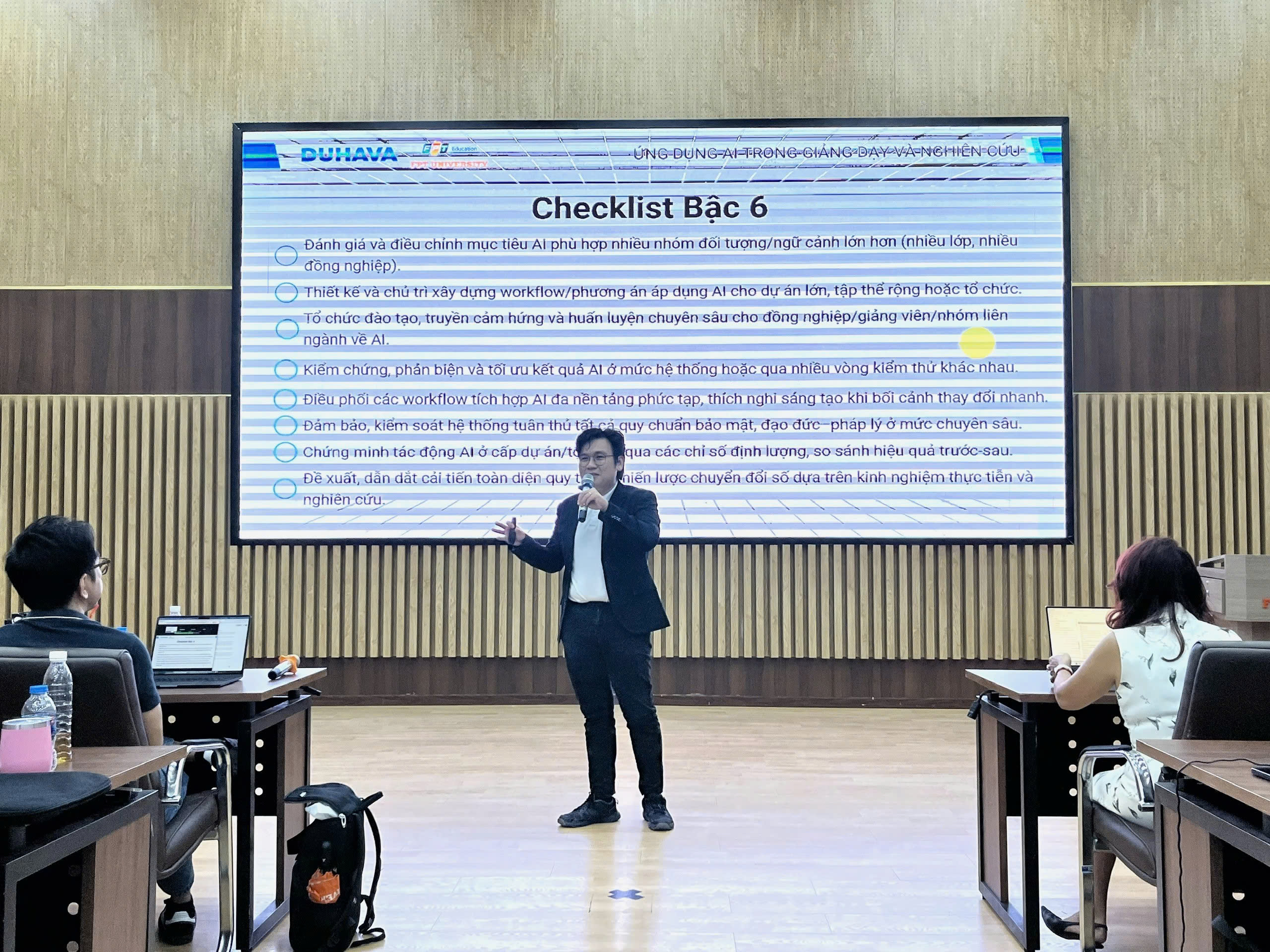 Diễn giả Nguyễn Phước Vĩnh Hưng – Founder – Duhava Technology, người đã có nhiều năm kinh nghiệm trong lĩnh vực AI, kinh doanh và marketing đã chia sẻ tổng quan về AI trong giáo dục, các công cụ như ChatGPT Projects, GPTs/Gems và cách AI trở thành “trợ lý số” hỗ trợ giảng viên trong thiết kế bài giảng, chấm điểm, phản hồi cũng như nghiên cứu học thuật. Quan trọng hơn, anh nhấn mạnh rằng AI cần được sử dụng có trách nhiệm, minh bạch và luôn đặt chuẩn mực học thuật lên hàng đầu.