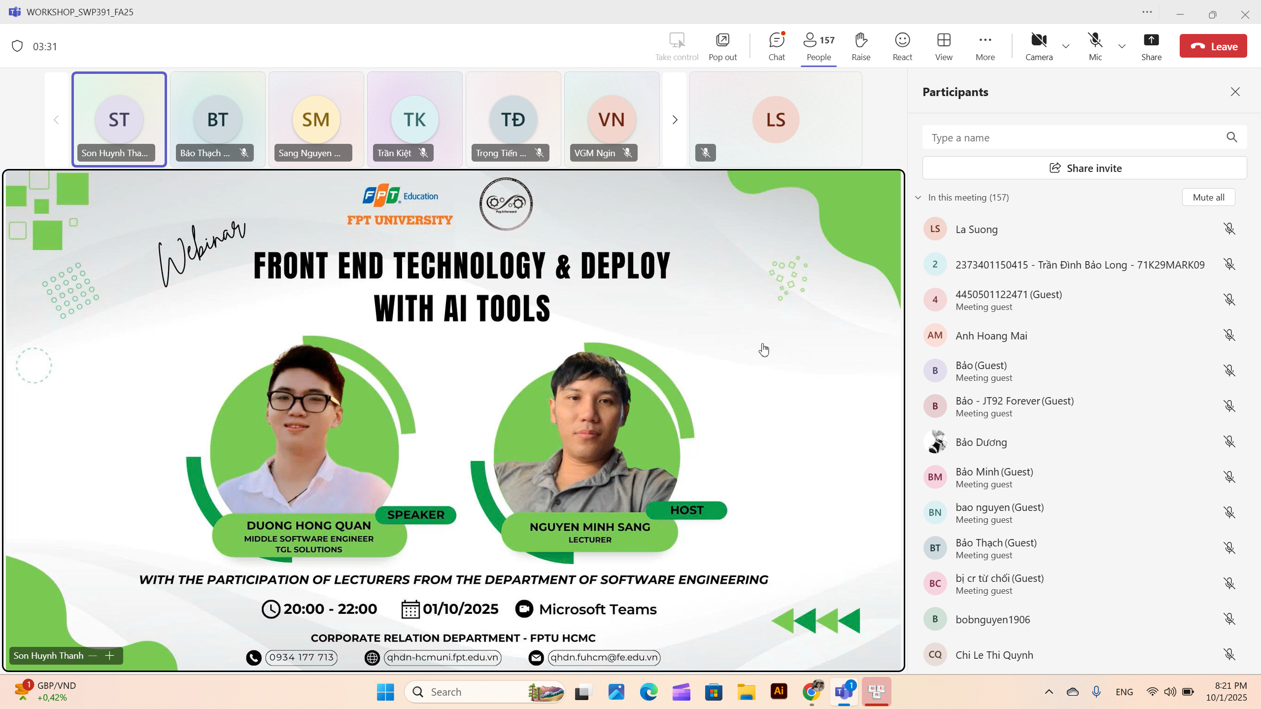 Chuỗi Webinar đã mang đến cho các bạn sinh viên góc nhìn từ toàn diện đến chi tiết, từ phân tích yêu cầu đến triển khai và vận hành một ứng dụng web, kết hợp áp dụng những công cụ AI hiện đại trong phát triển phần mềm, đến từ những chia sẻ đầy kinh nghiệm và tận tâm của các Giảng viên Bộ môn Kỹ thuật Phần mềm cùng diễn giả khách mời Anh Dương Hồng Quân – Middle Software Engineer – TGL Solutions.