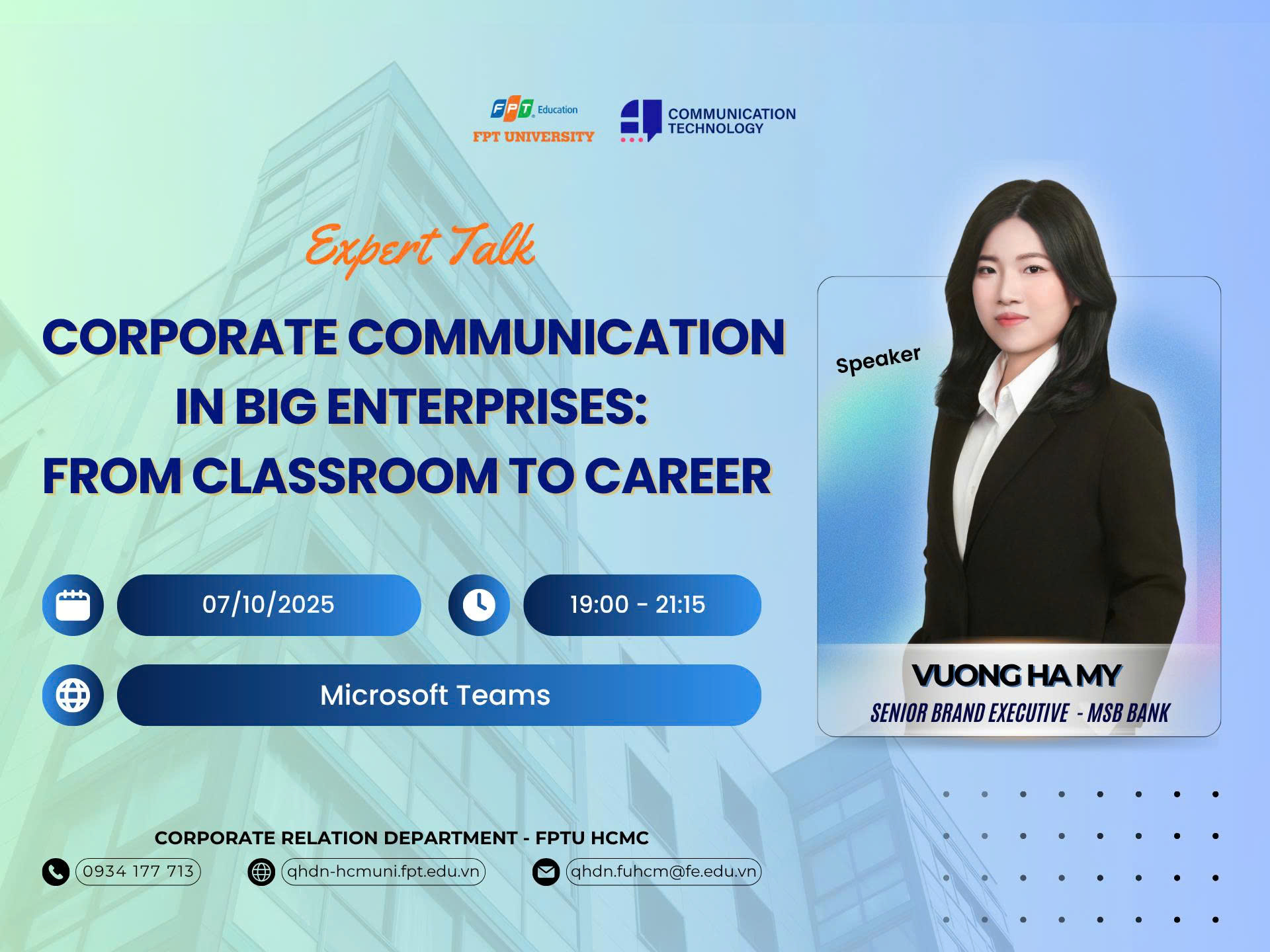 Expert Talk “Corporate Communication In Big Enterprises: From Classroom To Career” với sự tham gia của Chị Vương Hà My – Senior Brand Executive, Vietnam Maritime Commercial Joint Stock Bank (MSB) – sẽ cùng các bạn sinh viên đi tìm câu trả lời cho câu hỏi này.