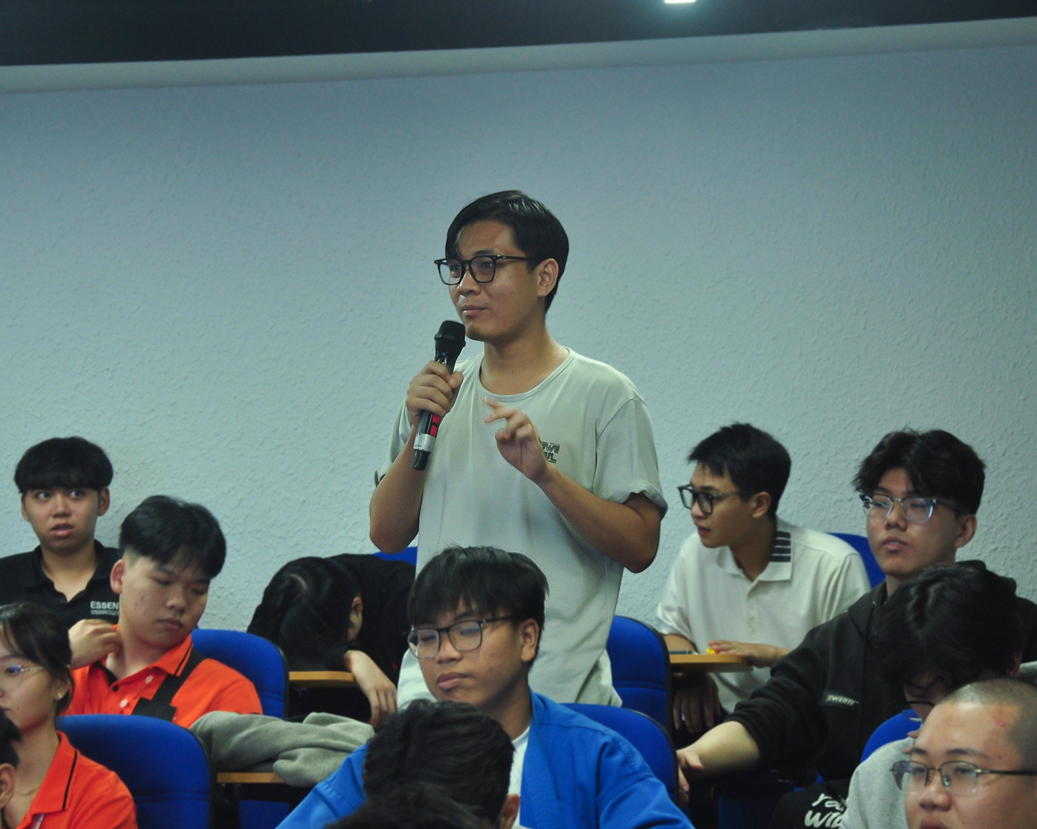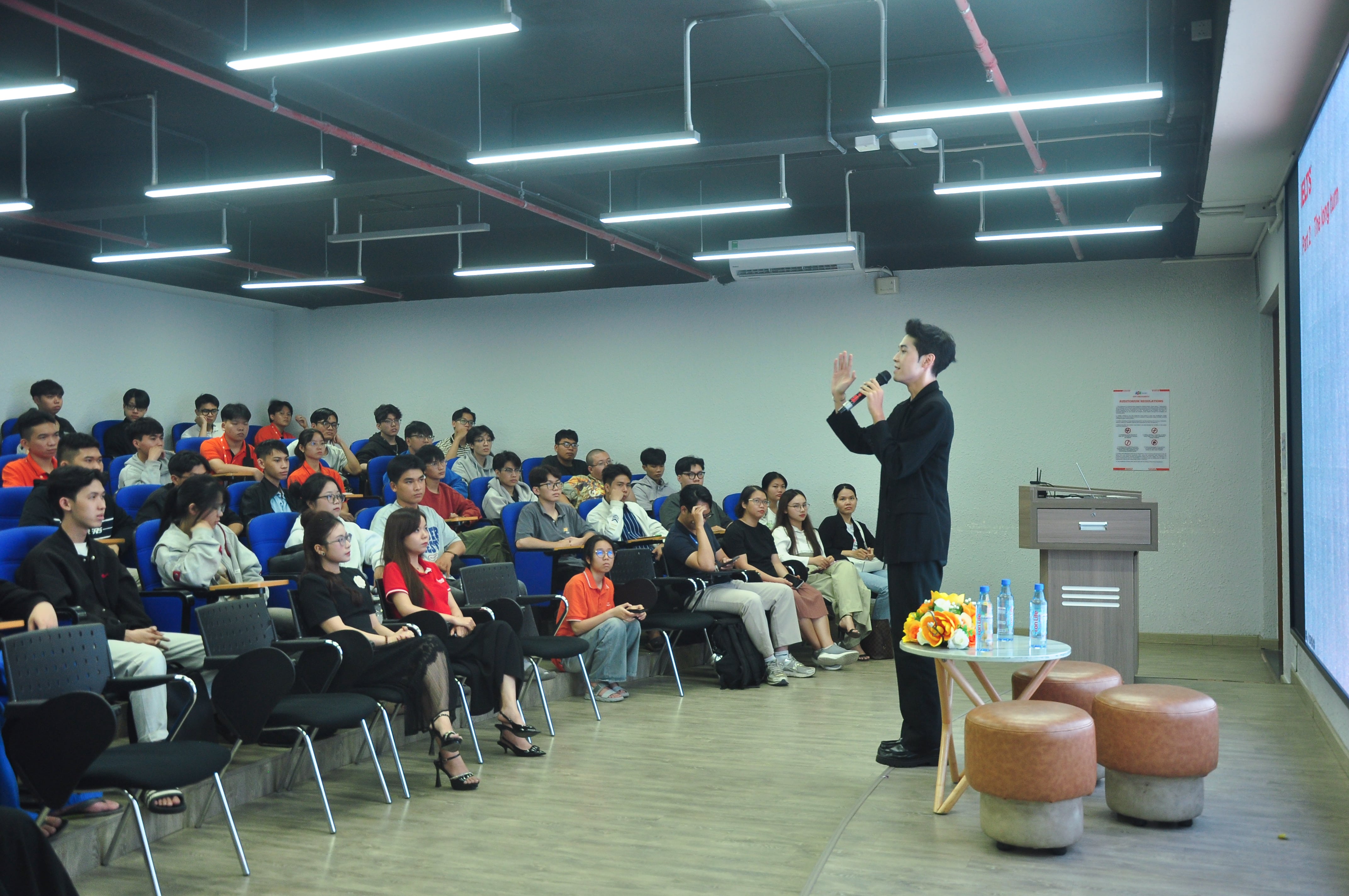 Buổi chiều, sinh viên tiếp tục tham dự Workshop “Bí kíp chinh phục kỹ năng Speaking IELTS 6.5+” do thầy Nguyễn Thanh Lộc, giảng viên đạt IELTS 9.0 đến từ IELTS Fighter, trực tiếp hướng dẫn. Trong buổi chia sẻ, thầy Lộc đã mang đến nhiều kinh nghiệm thực tế, chỉ ra những lỗi thường gặp và chia sẻ chiến lược giúp sinh viên cải thiện kỹ năng Speaking một cách hiệu quả. Đặc biệt, IELTS Fighter cũng đã trao tặng những suất học bổng giá trị dành cho các tân sinh viên xuất sắc hoàn thành bài luận trong chương trình học bổng IELTS trước đó. Buổi workshop không chỉ mang lại kiến thức chuyên môn hữu ích mà còn truyền cảm hứng, giúp sinh viên tự tin hơn trong hành trình chinh phục IELTS và phát triển năng lực ngoại ngữ của bản thân.