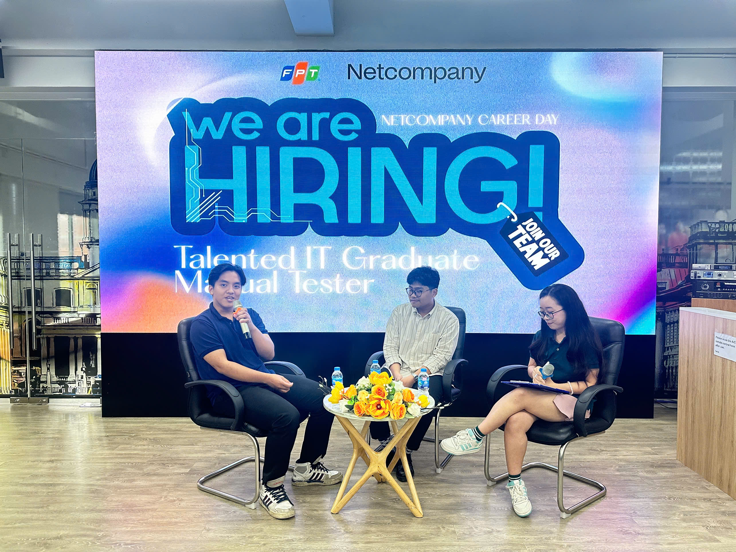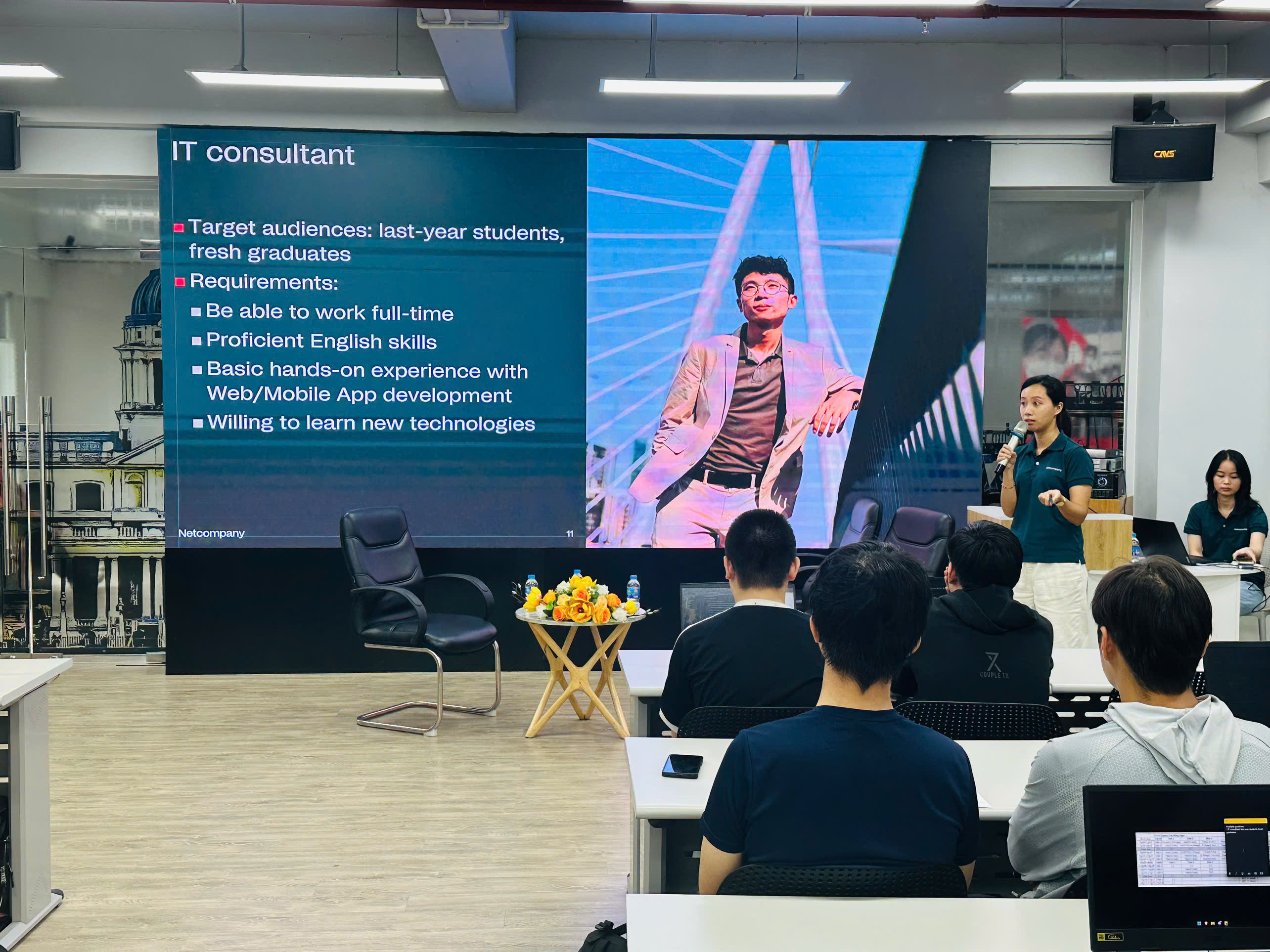 Hai bạn đã mang đến những câu chuyện chân thật, truyền cảm hứng về hành trình từ ghế giảng đường đến môi trường làm việc chuyên nghiệp tại Netcompany. Những chia sẻ ấy không chỉ giúp sinh viên hiểu rõ hơn về con đường sự nghiệp trong ngành IT mà còn tiếp thêm động lực để các bạn mạnh dạn theo đuổi đam mê.