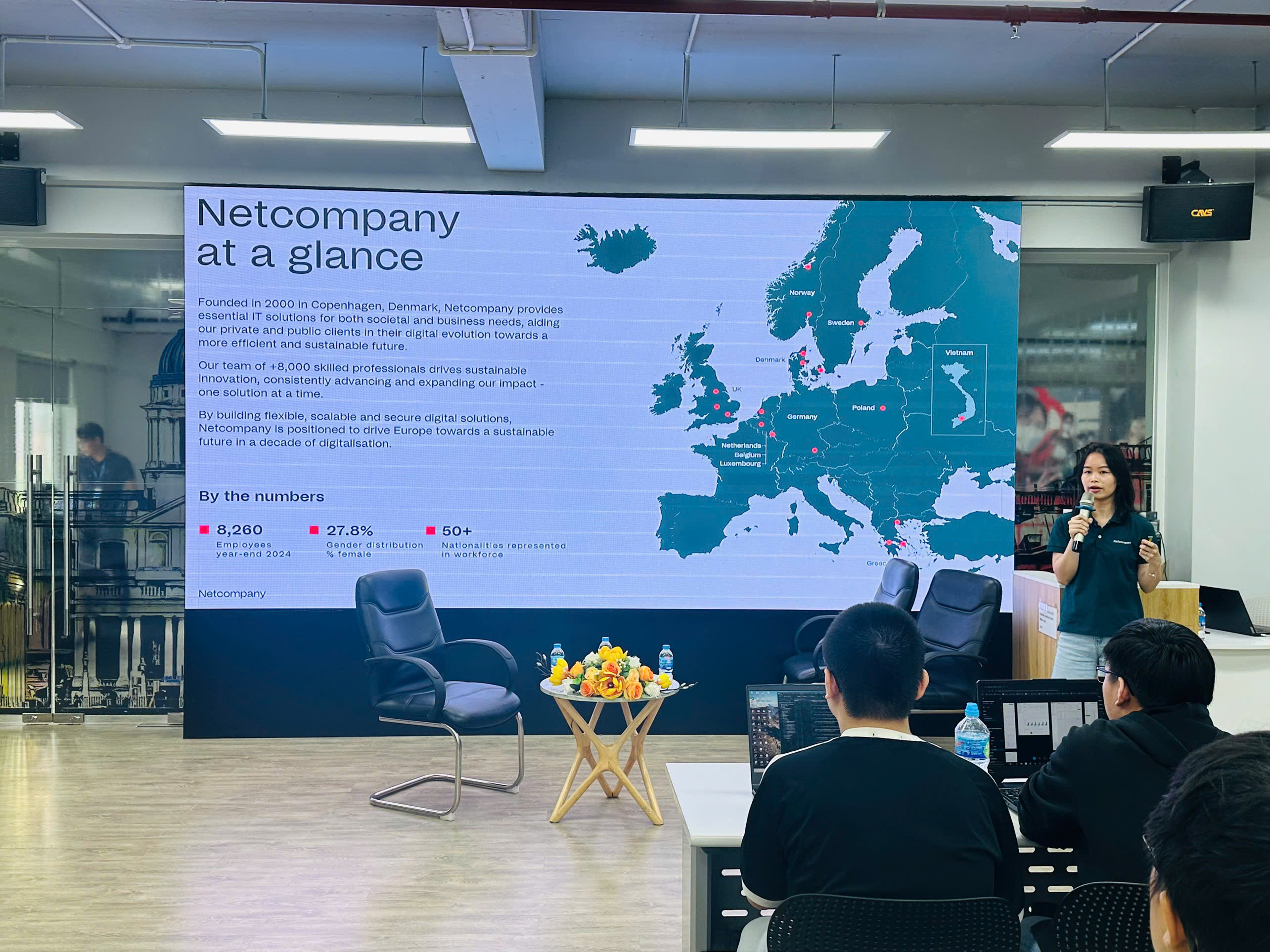 Mở đầu chương trình, đại diện Netcompany đã mang đến phần chia sẻ vô cùng ý nghĩa về văn hóa doanh nghiệp, môi trường làm việc hiện đại cùng những cơ hội nghề nghiệp hấp dẫn dành cho sinh viên. Qua đó, các bạn có thể hình dung rõ hơn bức tranh về một môi trường quốc tế chuyên nghiệp, nơi đề cao tinh thần học hỏi, đổi mới và phát triển bền vững – những yếu tố đã làm nên thương hiệu toàn cầu của Netcompany.
