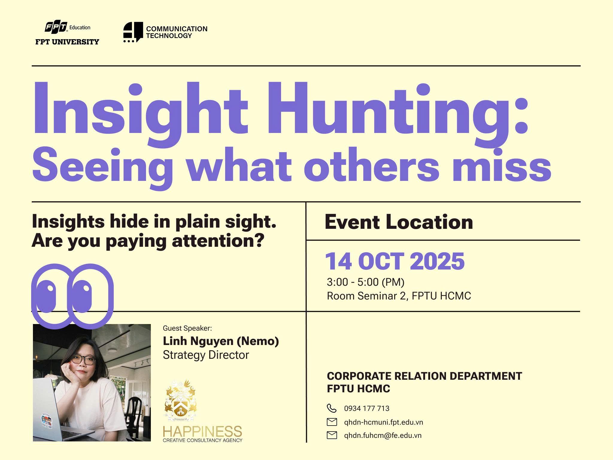 Workshop “Insight Hunting: Seeing What Others Miss” này được thiết kế để đưa insight trở về đúng bản chất của nó bằng việc quan sát, lắng nghe và thấu hiểu con người nhiều hơn.