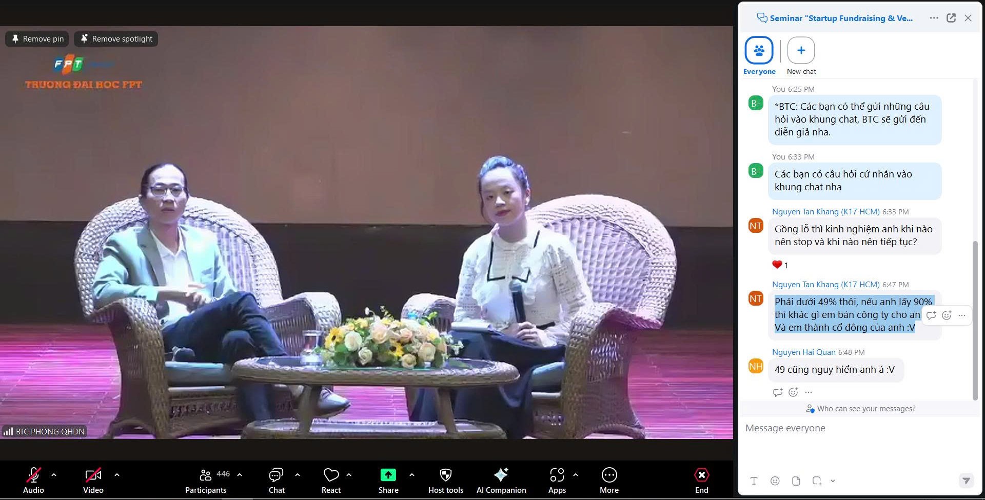 Nhiều câu hỏi thiết thực đã được đặt ra từ các bạn sinh viên xoay quanh việc làm sao quản lý tài chính tốt nhất, cách nào để gọi vốn và tận dụng nguồn vốn hiệu quả… Seminar không chỉ cung cấp nhiều kiến thức bổ ích về quản lý và huy động vốn cho các bạn sinh viên trên con đường khởi nghiệp, mà còn khơi gợi động lực và giúp các bạn dễ dàng chinh phục nhà đầu tư.