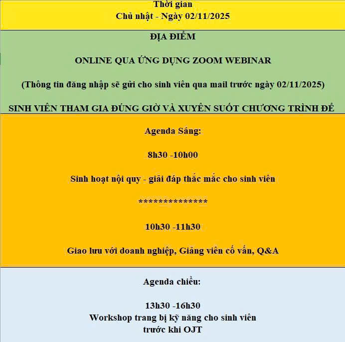 – Sinh viên cài đặt trước ứng dụng Zoom và đăng nhập trước 15 phút so với thời gian bắt đầu chương trình. (Thông tin đăng nhập sẽ được gửi qua email cho sinh viên trước ngày 30/10/2025)
