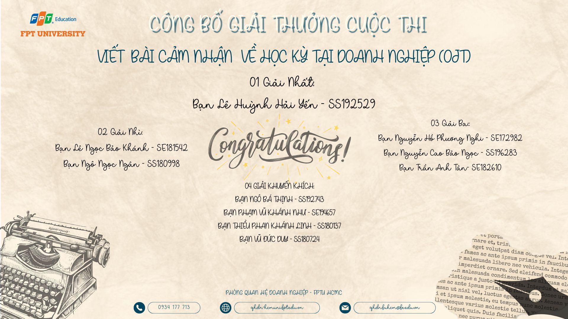 Sau thời gian phát động và nhận được sự hưởng ứng tích cực từ các bạn sinh viên, cuộc thi đã chính thức khép lại và xin chúc mừng các cá nhân xuất sắc đạt giải thưởng như sau: