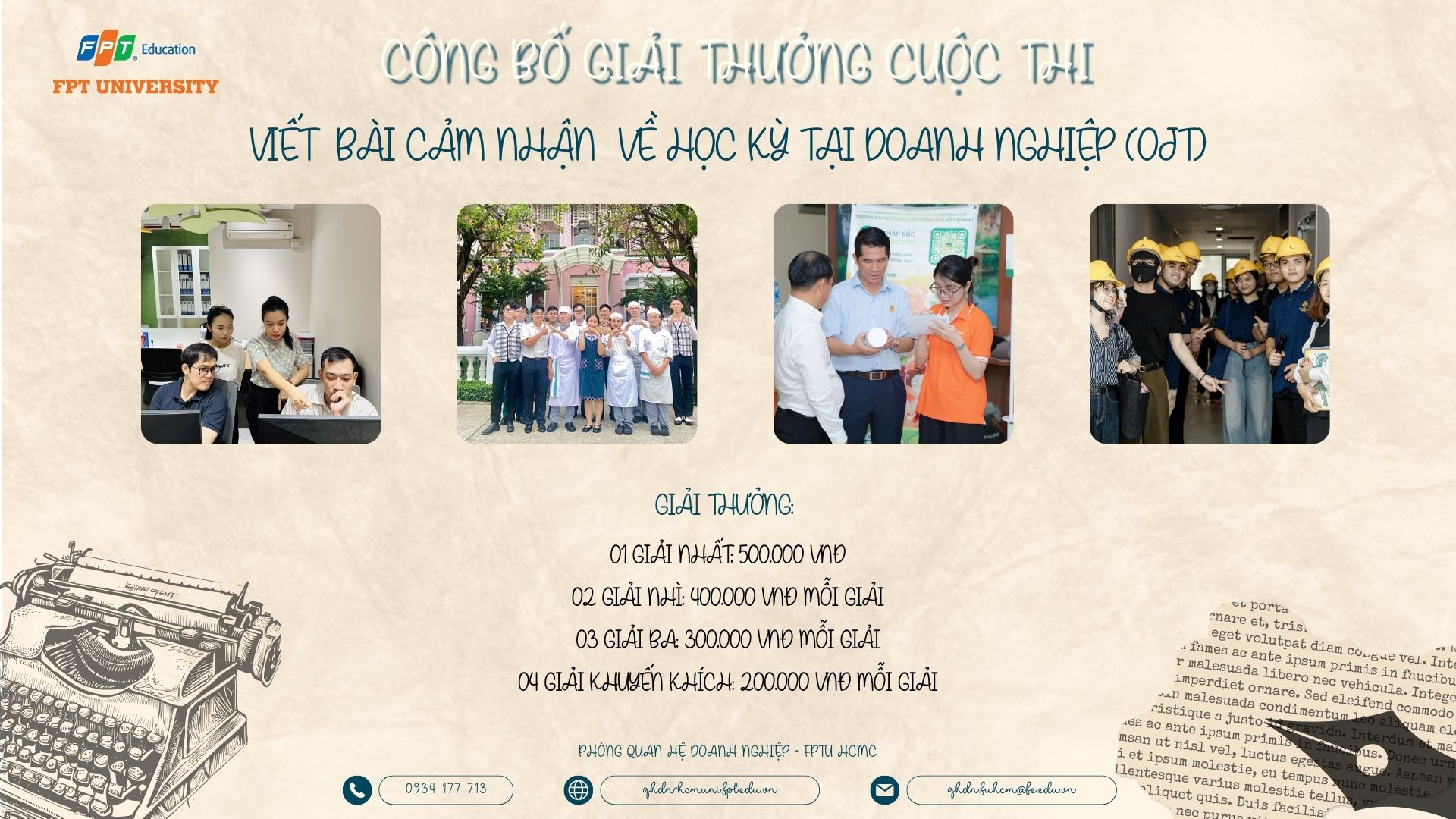 Nhằm lan tỏa tinh thần học hỏi, chia sẻ những trải nghiệm ý nghĩa trong Học kỳ tại doanh nghiệp (On the Job Training – OJT), Phòng Quan hệ Doanh nghiệp – Trường Đại học FPT TP. Hồ Chí Minh phát động cuộc thi “Viết bài cảm nhận về Học kỳ tại doanh nghiệp (OJT)” dành cho sinh viên các khóa đã và đang tham gia chương trình.