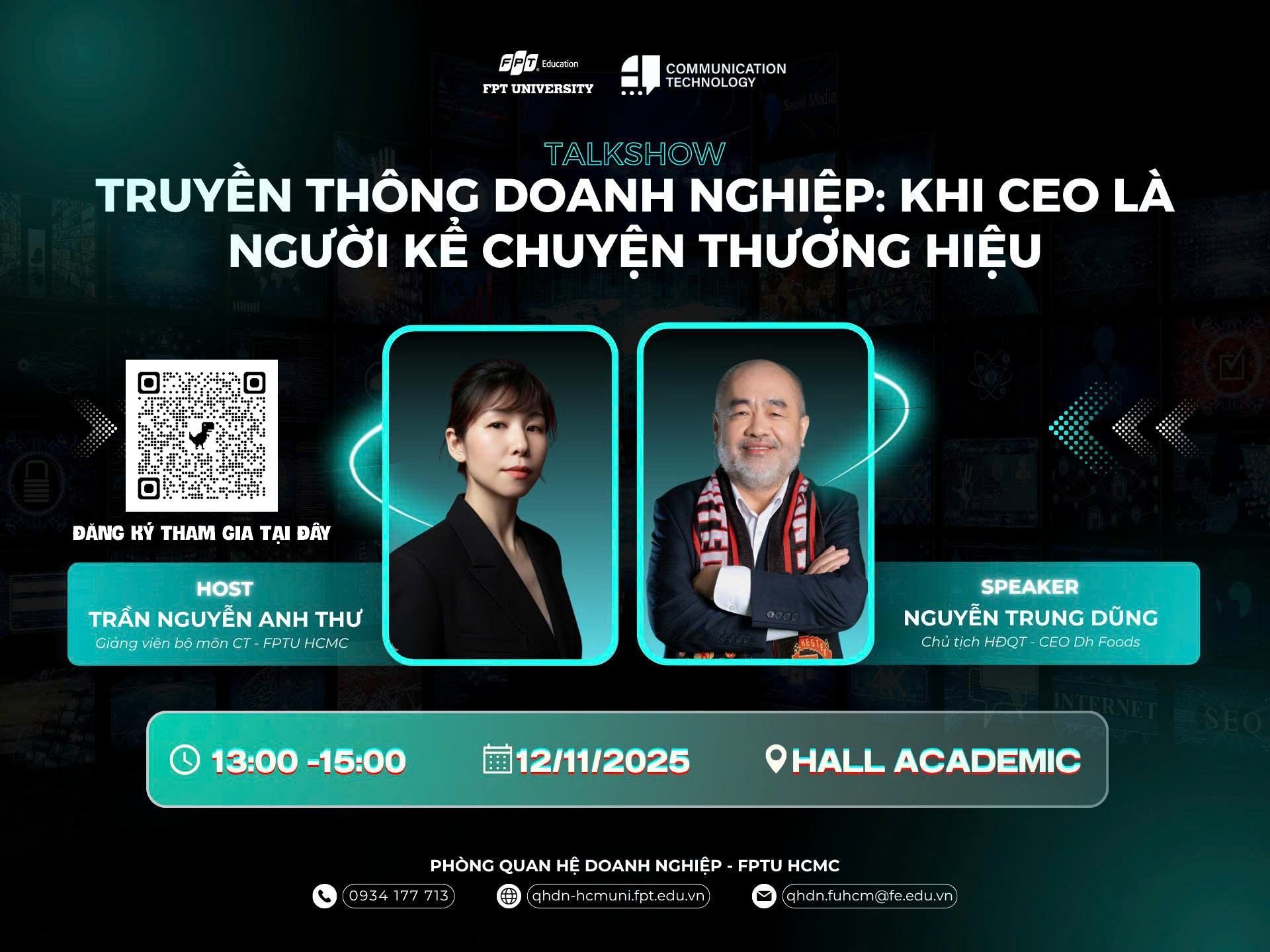 Trong bối cảnh thương hiệu cần sự dẫn dắt mạnh mẽ từ đội ngũ lãnh đạo, Talkshow “Truyền Thông Doanh Nghiệp: Khi CEO Là Người Kể Chuyện Thương Hiệu” được tổ chức nhằm giúp sinh viên hiểu rõ vai trò của CEO trong truyền thông doanh nghiệp, cách hình ảnh cá nhân lãnh đạo có thể song hành và cộng hưởng với thương hiệu tổ chức.