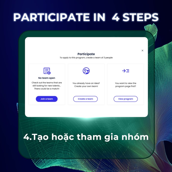 Đến với bước 4, bạn hãy tham gia team đã có sẵn (nếu chưa đủ thành viên) hoặc tự thành lập một team mới với tư cách nhóm trưởng (có quyền chấp nhận/ từ chối các thành viên tiếp theo)