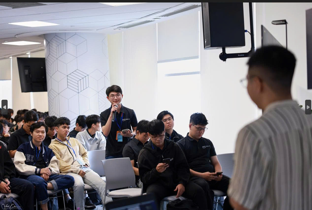 Sinh viên tham dự chăm chú lắng nghe và đặt nhiều câu hỏi xoay quanh các tình huống thực tế, từ quản lý truy cập, mã hóa dữ liệu đến bảo mật hạ tầng khi triển khai ứng dụng trên nền tảng AWS. Sự trao đổi sôi nổi giúp các bạn hiểu rõ hơn cách vận dụng các tiêu chuẩn bảo mật vào dự án học tập và môi trường doanh nghiệp.