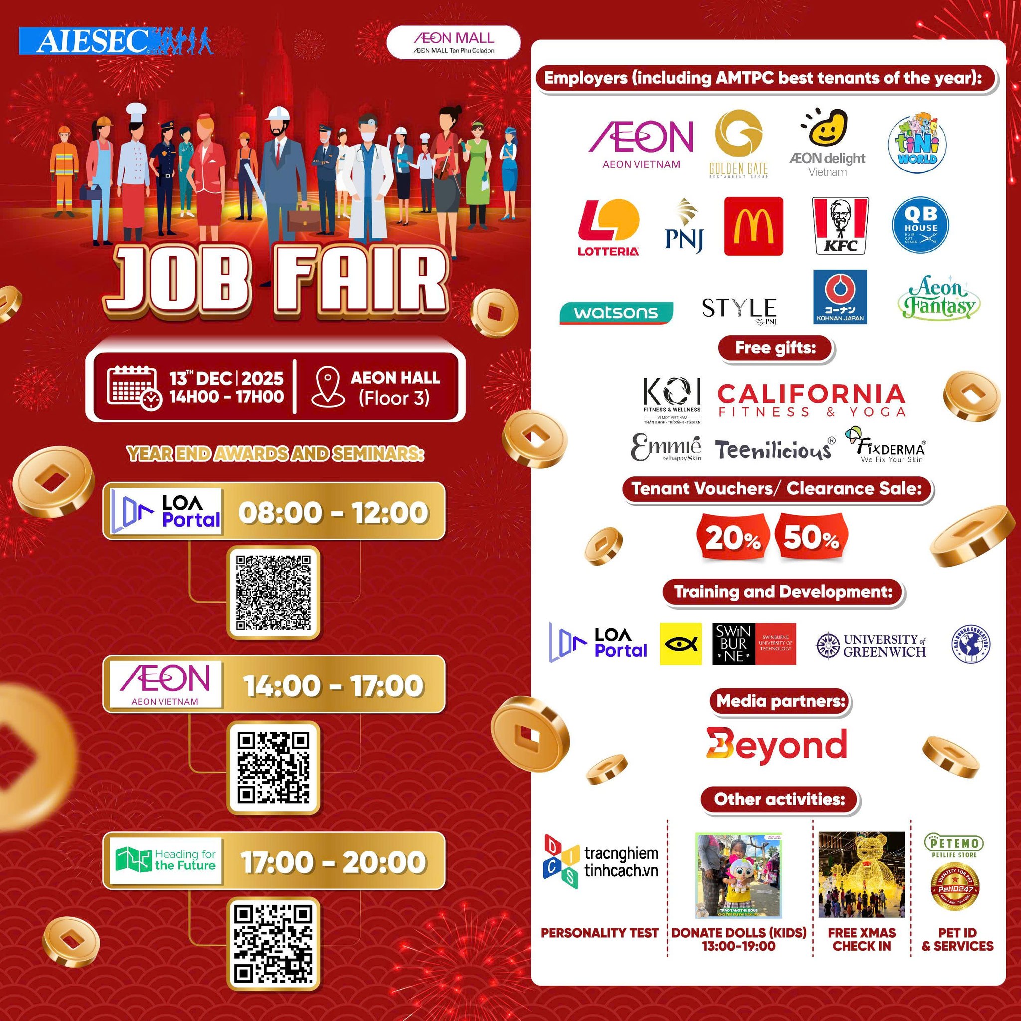 Ngày Hội Việc Làm “JOB FAIR” – đồng hành cùng AEON MALL Tân Phú Celadon và AIESEC với chuỗi hoạt động Hội Thảo, Tuyển Dụng, Quà tặng miễn phí cuối năm.