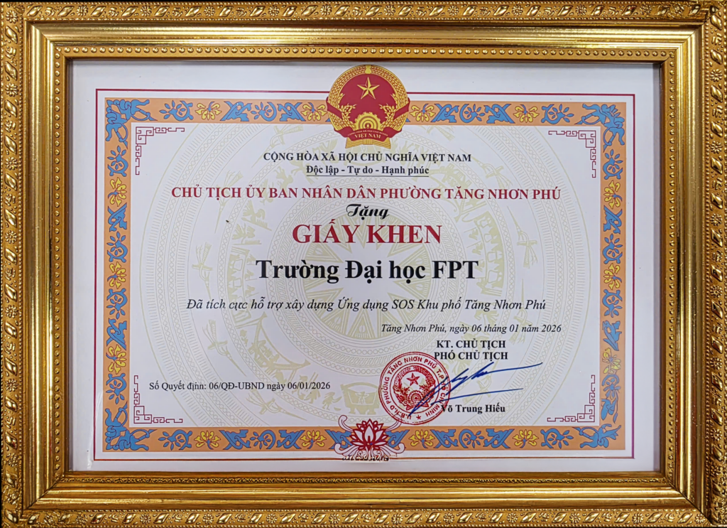 Tại sự kiện, lãnh đạo Trung tâm Chuyển đổi số TP.HCM và UBND phường đã trao thư cảm ơn cùng giấy khen cho tập thể, cá nhân từ phía Trường Đại học FPT vì những đóng góp nổi bật cho công tác chuyển đổi số tại địa phương.