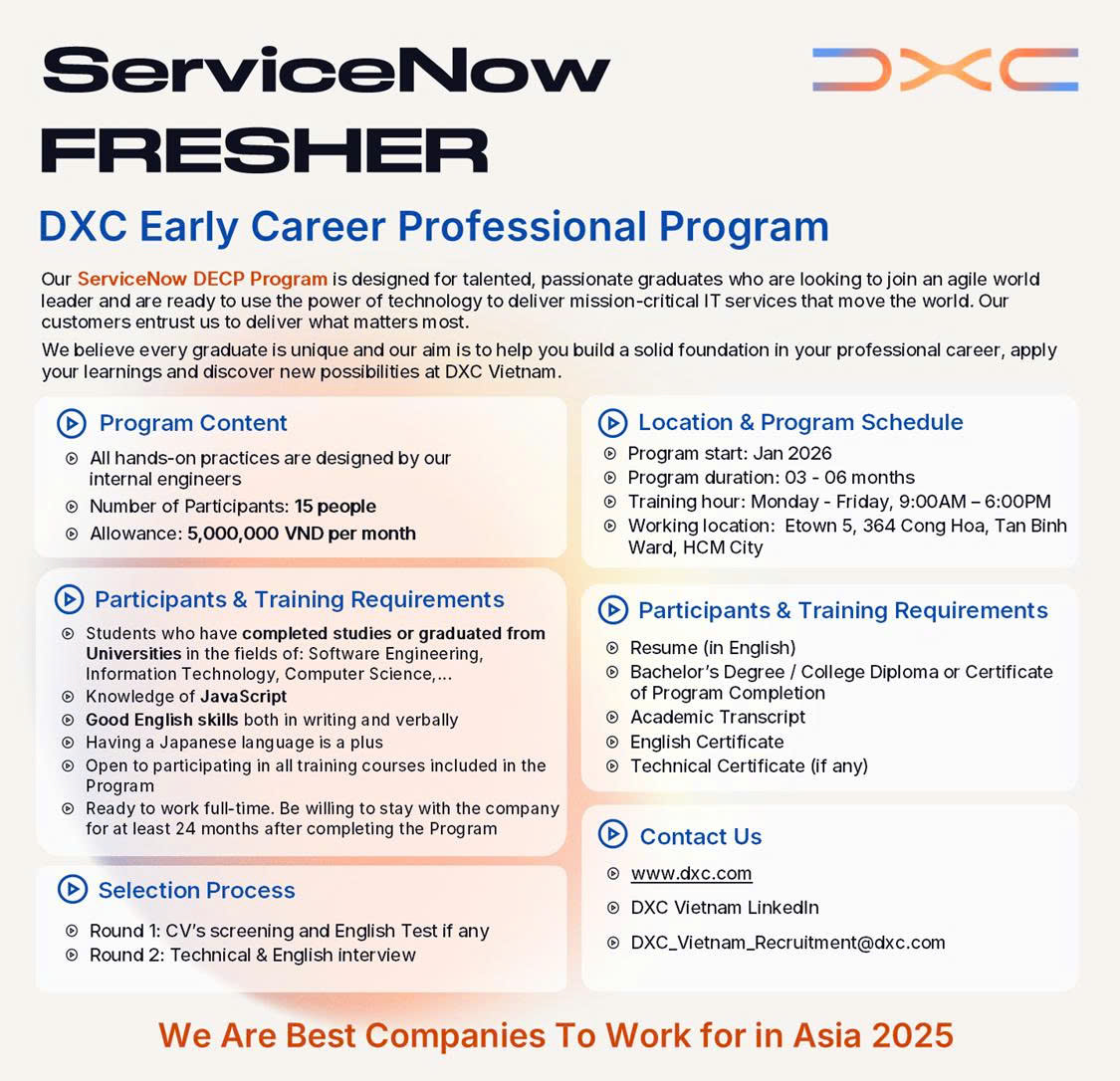 📢 Công ty DXC Vietnam đang tìm kiếm những tài năng trẻ đam mê công nghệ, sẵn sàng gia nhập môi trường quốc tế Agile và phát triển kỹ năng JavaScript (Low-Code Platform) cho chương trình đào tạo chuyên sâu tại TP. Hồ Chí Minh. Nếu bạn muốn xây dựng nền tảng vững chắc cho sự nghiệp và tìm kiếm cơ hội làm việc lâu dài, đây là cơ hội dành cho bạn.