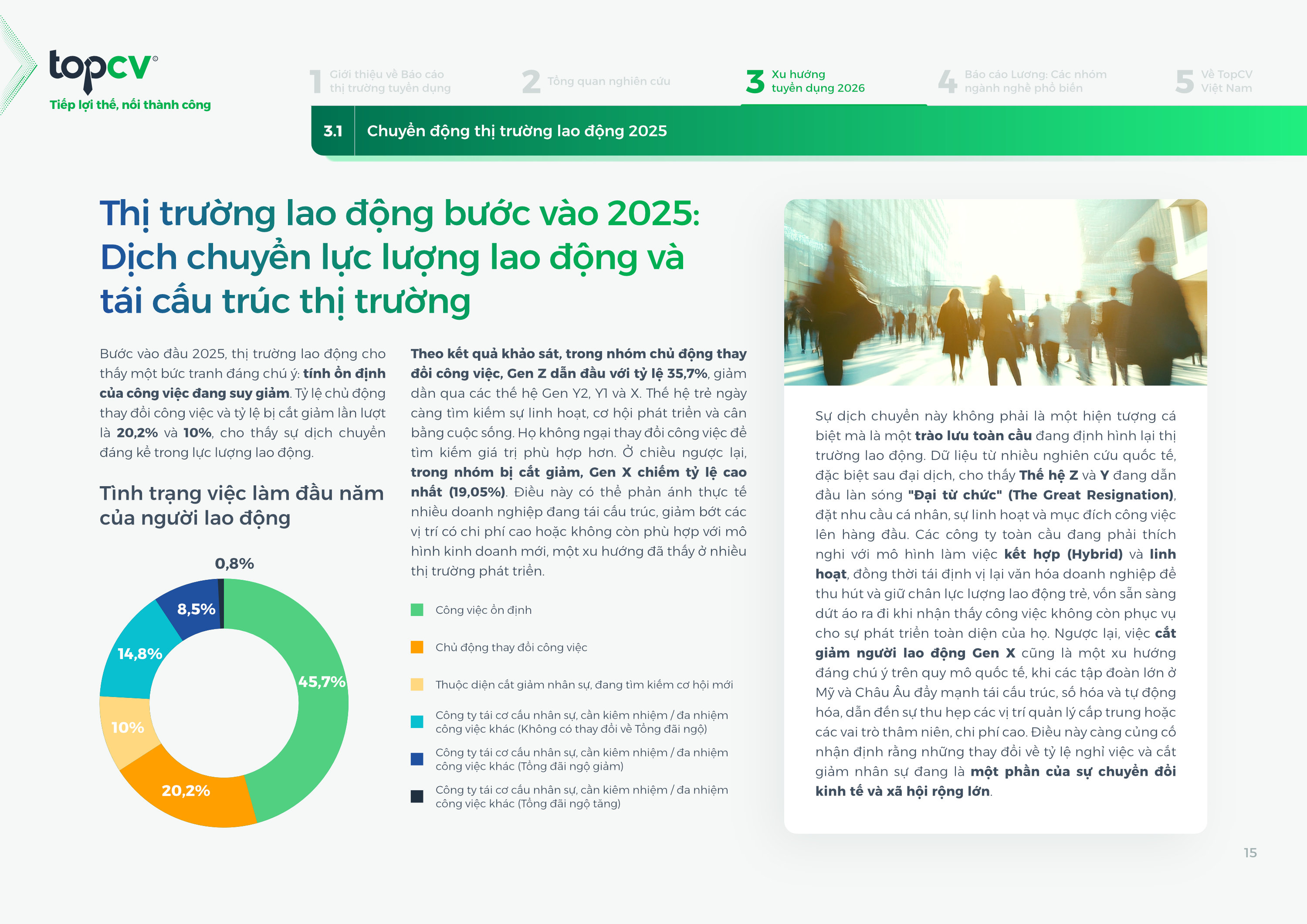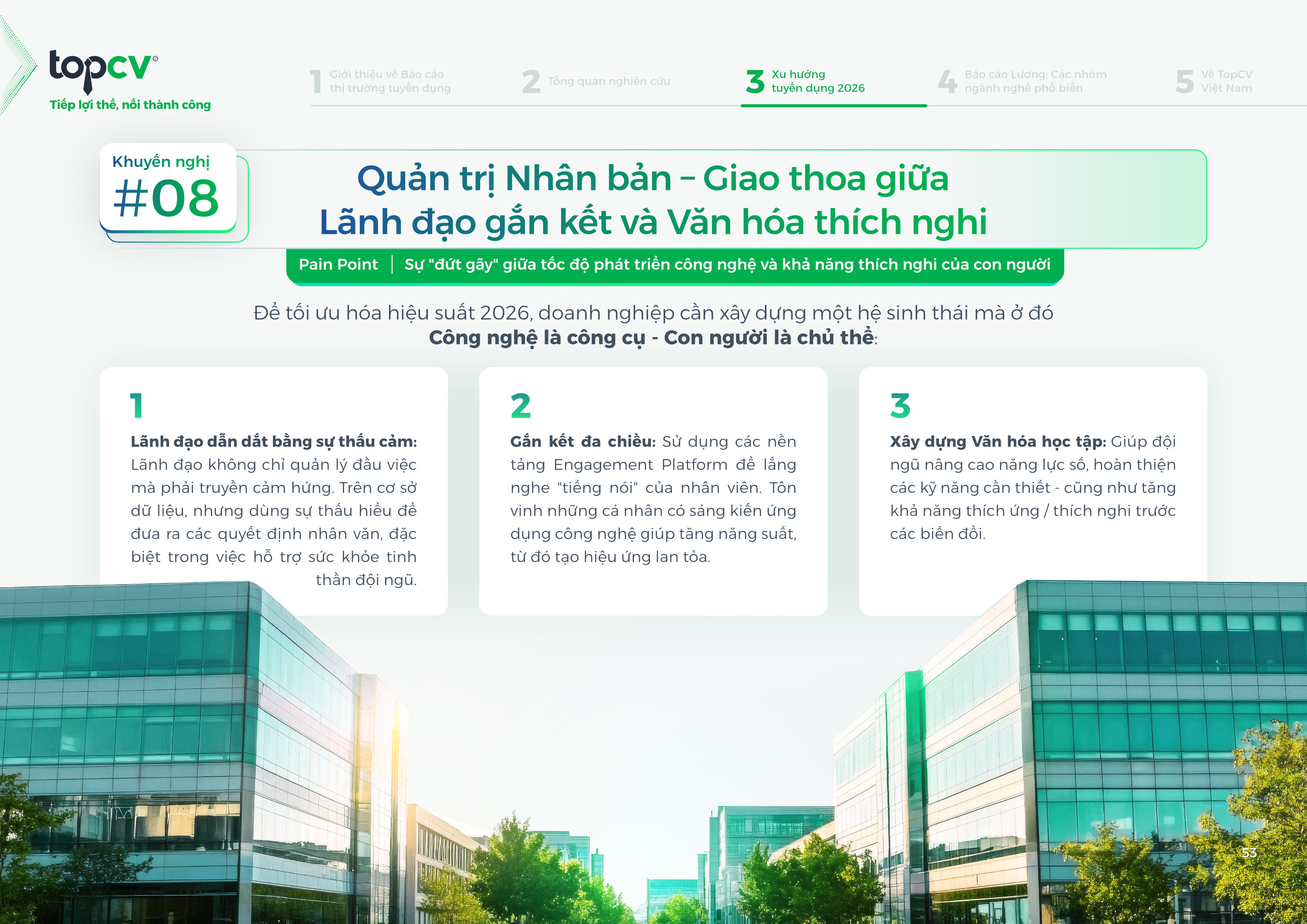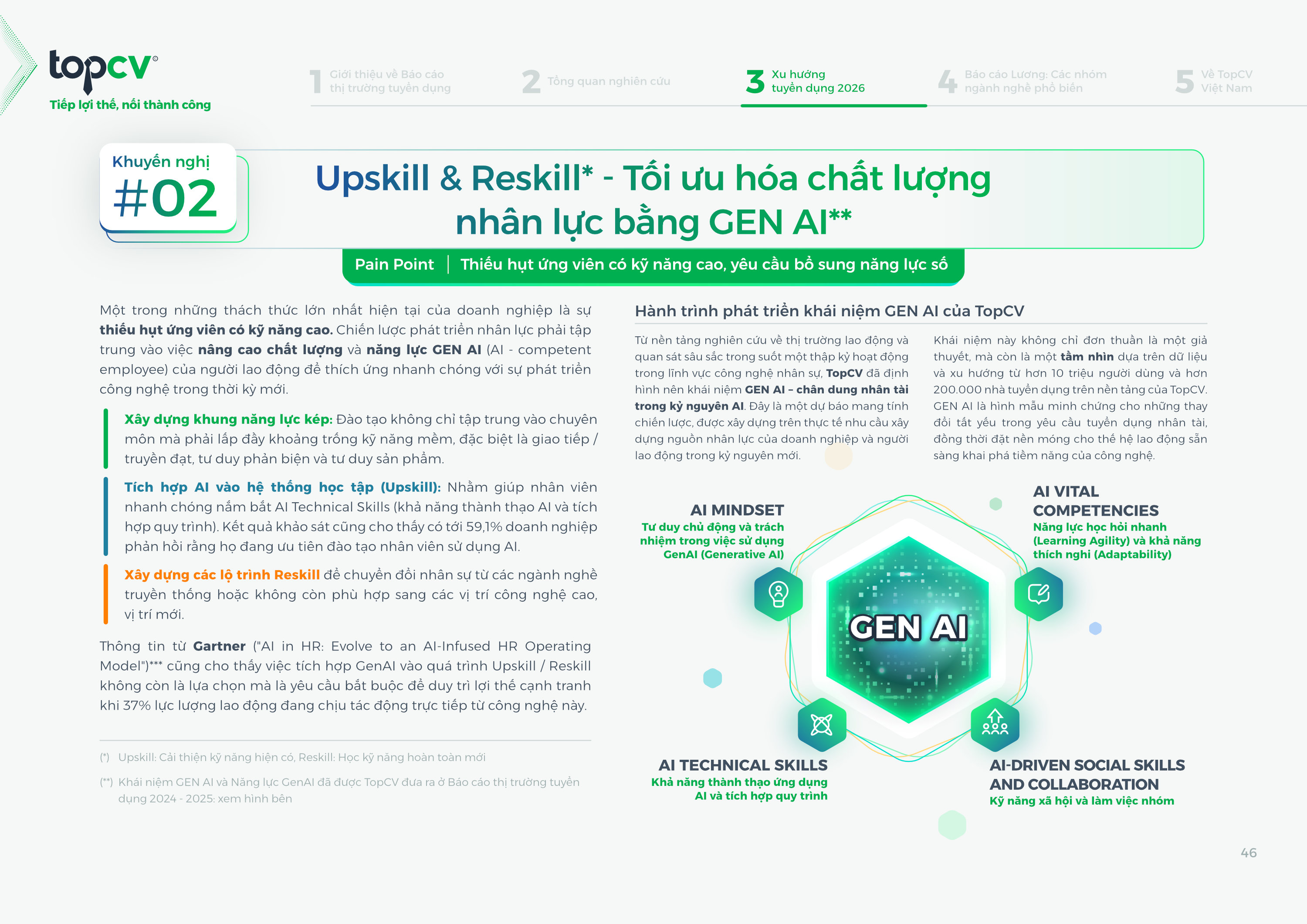 Báo cáo Thị trường Tuyển dụng 2025 – 2026 của TopCV, vừa được công bố, là báo cáo thường niên chuyên sâu được xây dựng trên dữ liệu khảo sát từ hơn 3.000 doanh nghiệp và người lao động trên toàn quốc, cung cấp nhiều góc nhìn đáng chú ý về xu hướng tuyển dụng, yêu cầu kỹ năng và sự dịch chuyển nghề nghiệp dưới tác động của AI và bối cảnh kinh tế mới.