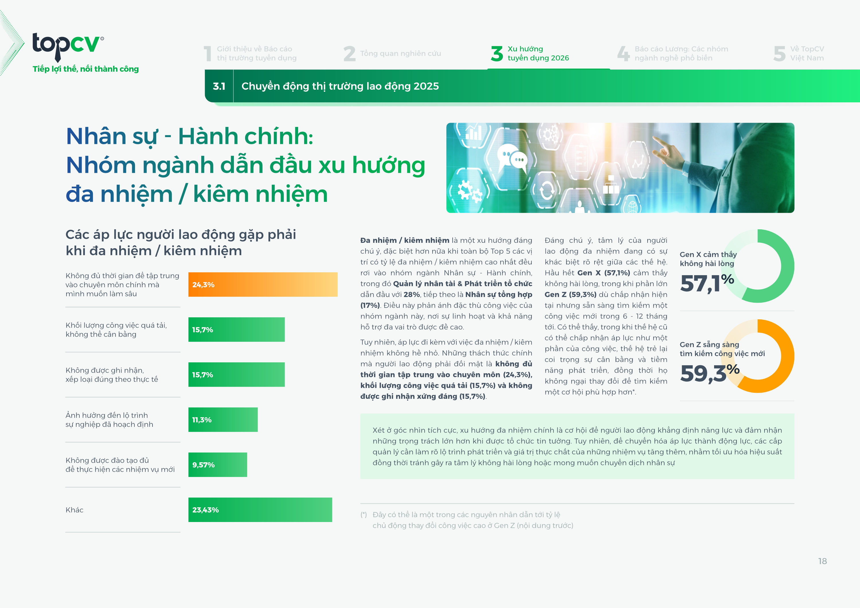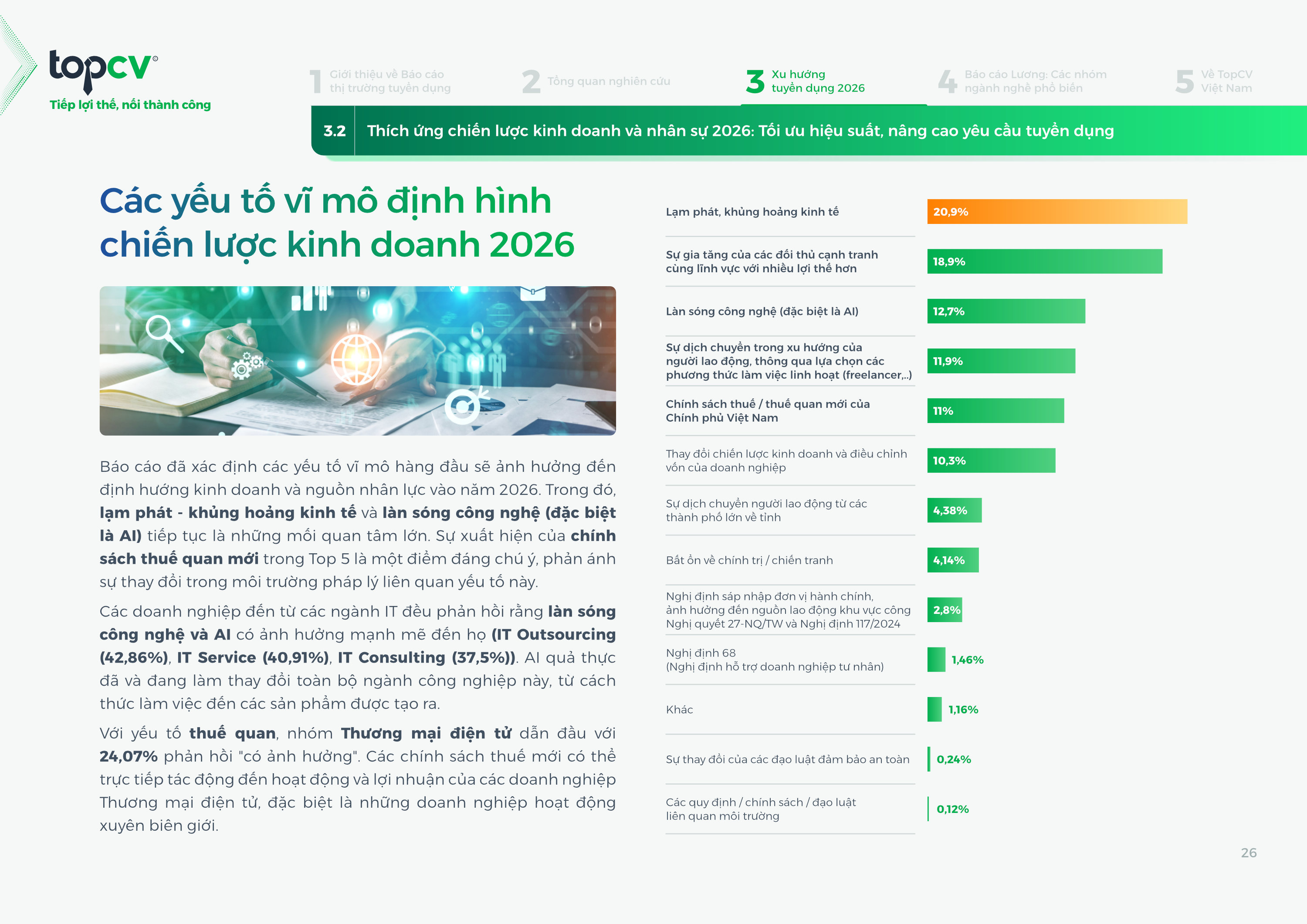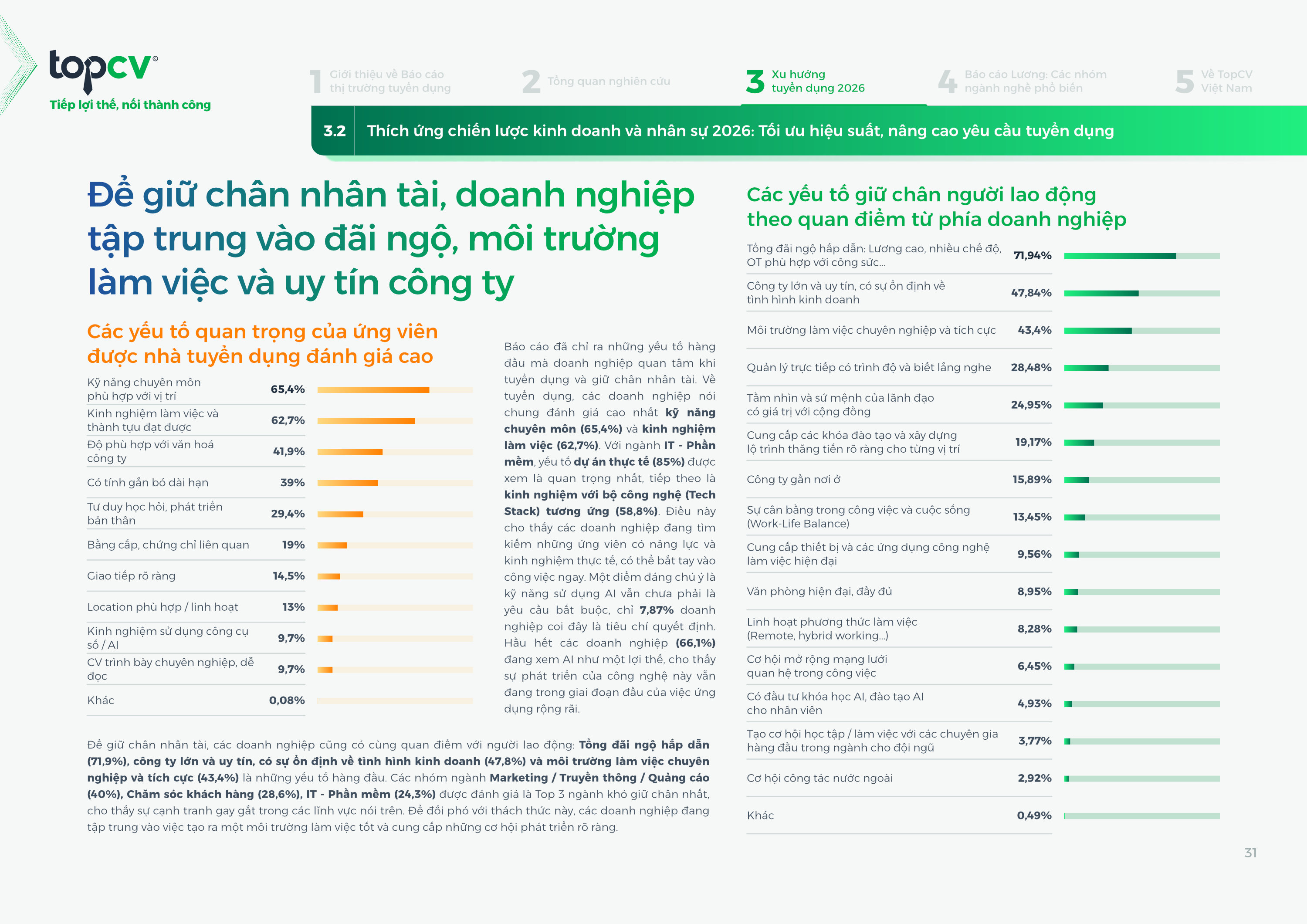 Báo cáo Thị trường Tuyển dụng 2025 – 2026 của TopCV, vừa được công bố, là báo cáo thường niên chuyên sâu được xây dựng trên dữ liệu khảo sát từ hơn 3.000 doanh nghiệp và người lao động trên toàn quốc, cung cấp nhiều góc nhìn đáng chú ý về xu hướng tuyển dụng, yêu cầu kỹ năng và sự dịch chuyển nghề nghiệp dưới tác động của AI và bối cảnh kinh tế mới.