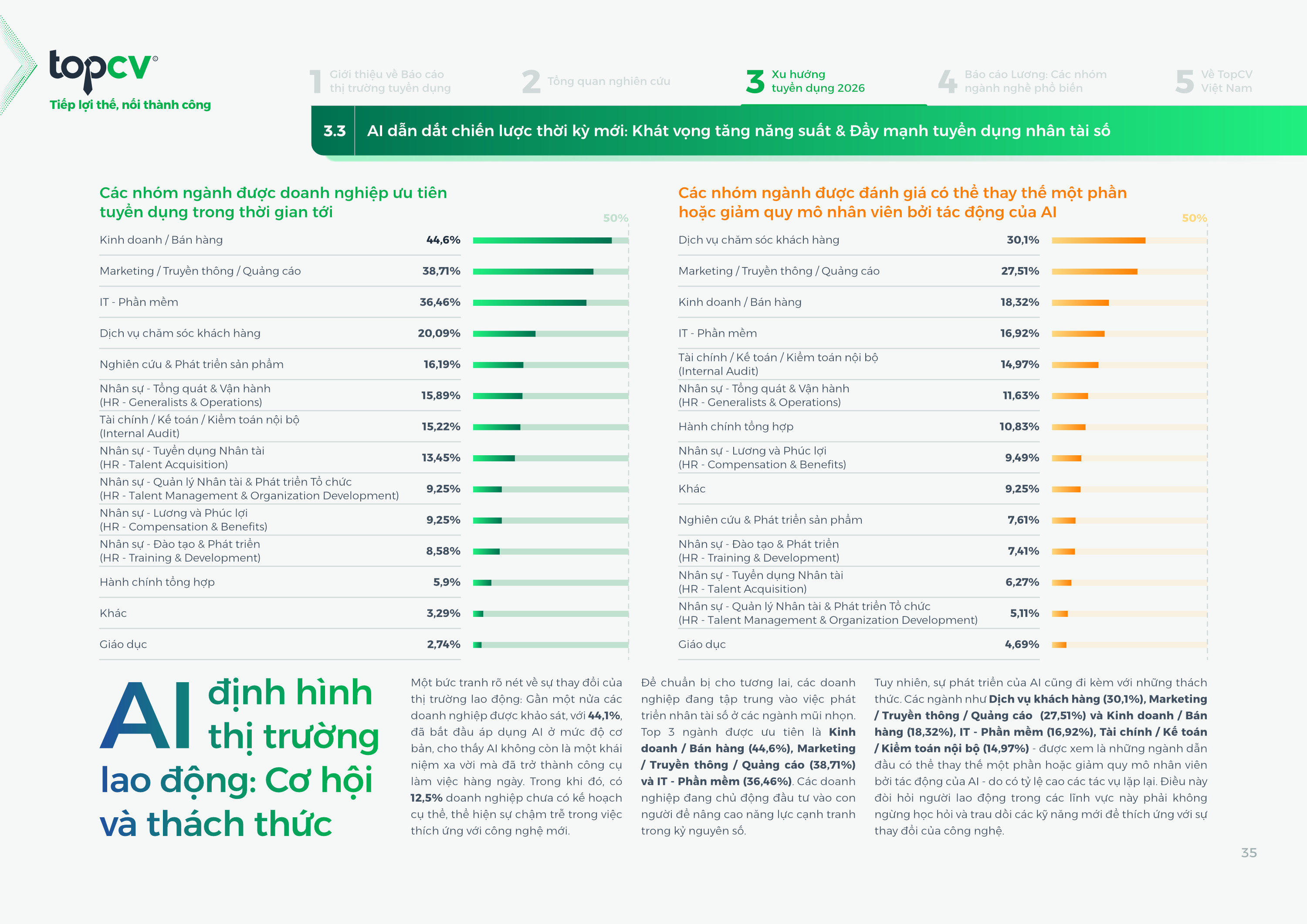 Do tính chất tài liệu nghiên cứu chuyên sâu được phát hành giới hạn, báo cáo đầy đủ hiện chỉ được chia sẻ cho đáp viên, đối tác và khách hàng đủ điều kiện của TopCV. Trong phạm vi phù hợp, một số nội dung nổi bật của báo cáo được tổng hợp trong các hình ảnh dưới đây, như những “gợi ý định hướng” đáng tham khảo cho sinh viên giai đoạn 2025 – 2026.
