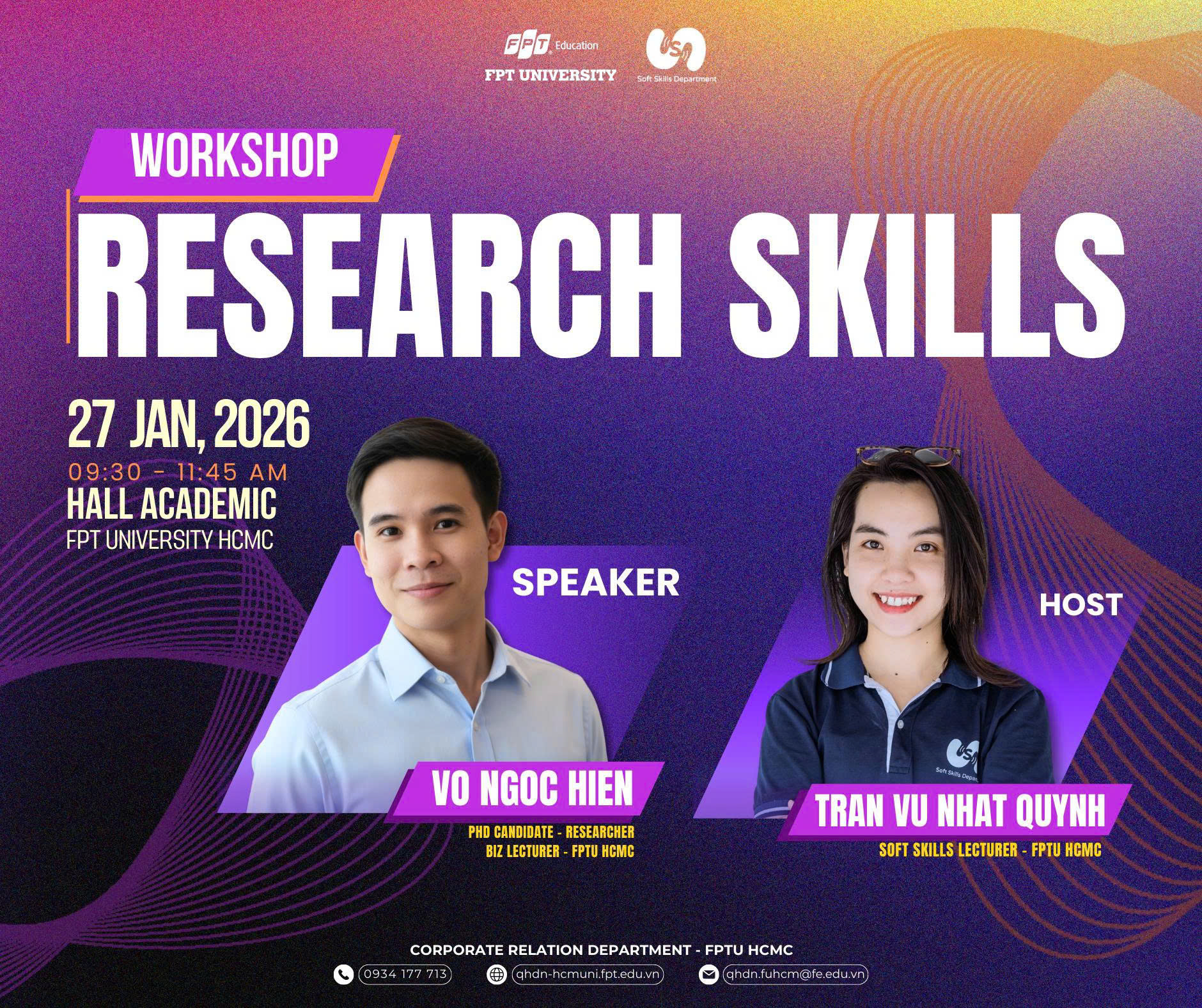 - Speaker: Thầy Võ Ngọc Hiền – Nghiên cứu sinh Tiến sĩ, Giảng viên Bộ môn BIZ – FPTU với bề dày kinh nghiệm trong nghiên cứu chuyên sâu. Thầy sẽ chia sẻ những góc nhìn thực tế, những thách thức và phương pháp tối ưu giúp sinh viên tự tin hơn trên con đường nghiên cứu.