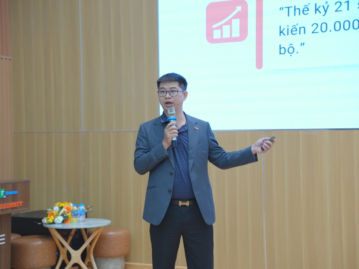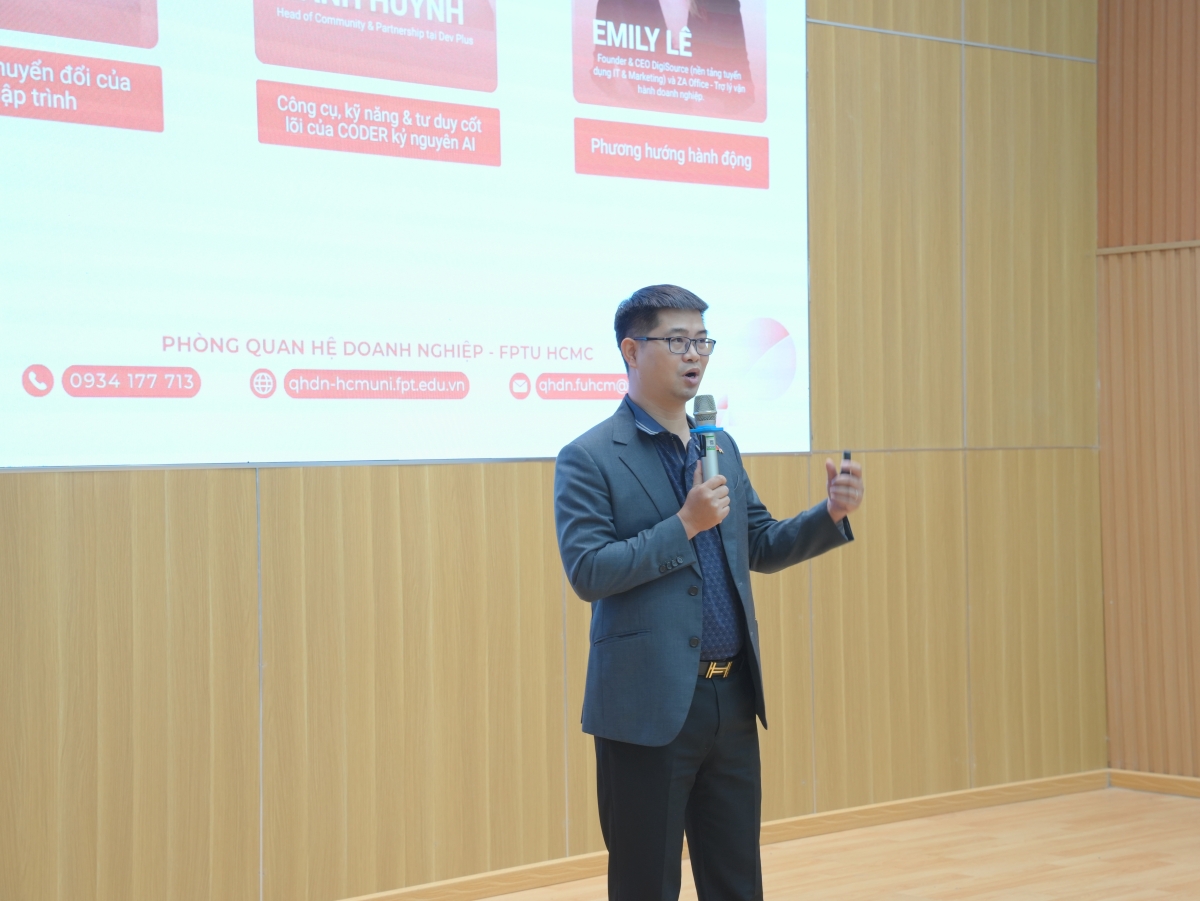 Mở đầu chương trình, anh Tài Nguyễn (Founder Naiscorp Robotics) – tác giả của nhiều đầu sách về AI – đã dẫn dắt các bạn sinh viên đi sâu vào bức tranh toàn cảnh của ngành lập trình hiện nay qua phần chia sẻ: “Beyond Code: Tầm nhìn chuyển đổi của nghề lập trình”.