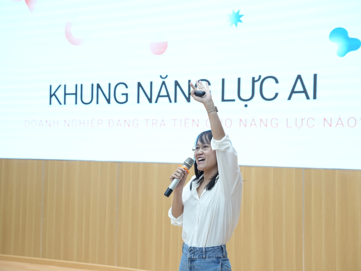 Tiếp nối mạch cảm hứng, chị Oanh Huỳnh (Head of Partnership and Community Dev Plus) đã mang đến những góc nhìn thực tế về bộ kỹ năng và tư duy cốt lõi (Mindset). Chị chia sẻ rằng, để đi xa trong nghề, các bạn sinh viên cần trang bị: