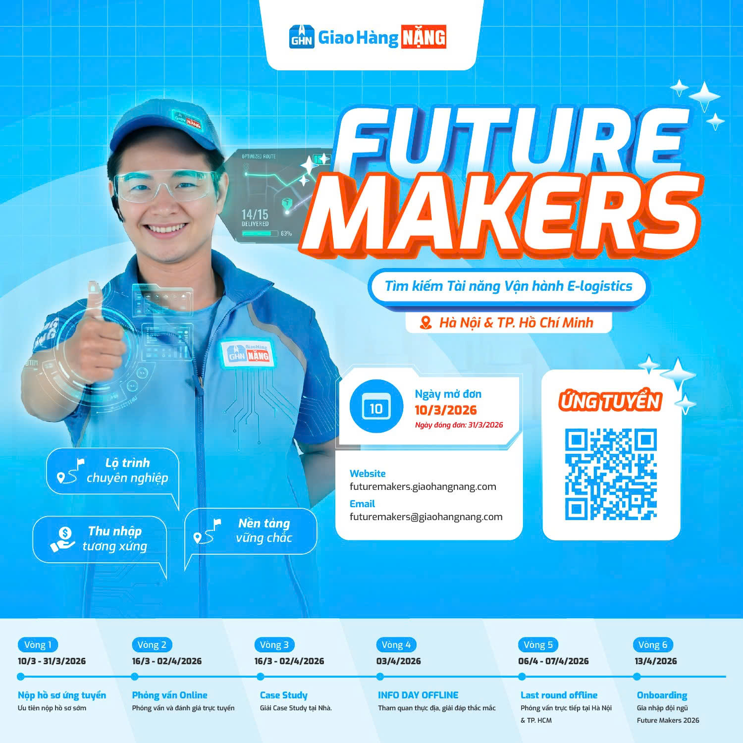 Năm nay, Future Makers 2026 mang đến nhiều cơ hội hơn cho các bạn trẻ tài năng, đã tốt nghiệp Khối ngành Logistics, Supply Chain, Kinh tế … để trở thành thủ lĩnh vận hành, nắm giữ vai trò Operations Team Leader (Trưởng nhóm Vận Hành) sau 12 tháng tại Giao Hàng Nặng.