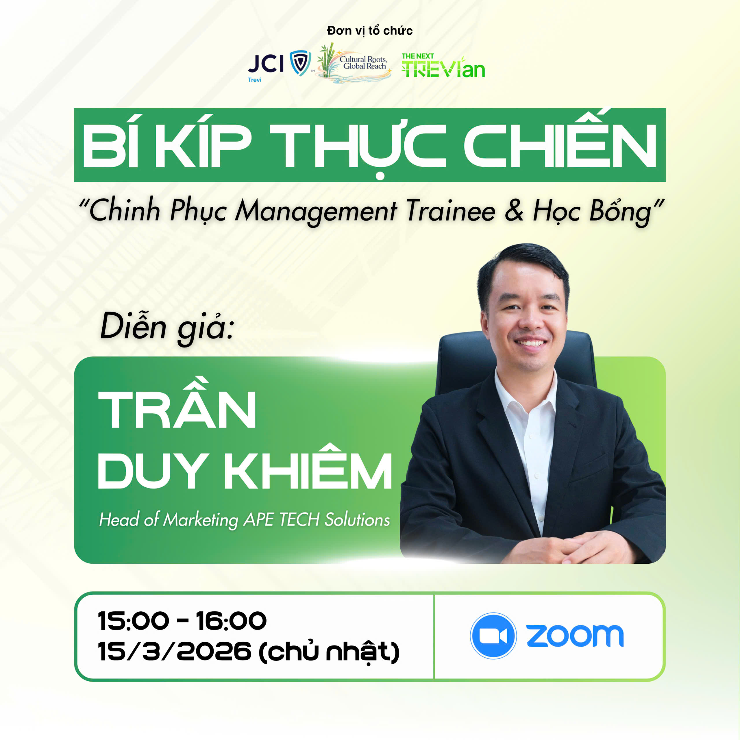 Nhằm giúp các bạn sinh viên tháo gỡ khó khăn và trang bị “vũ khí” tối tân cho hành trình sự nghiệp, JCI TREVI trân trọng mang đến buổi Workshop trực tuyến: “Bí kíp thực chiến: Chinh phục Management Trainee & Học bổng”.