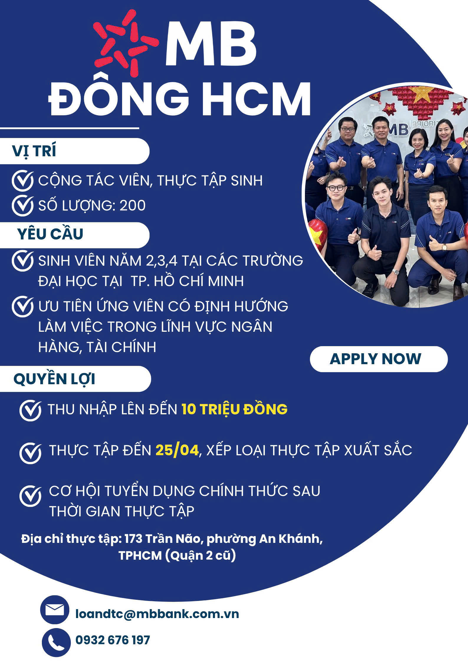 Bạn là sinh viên đang tìm kiếm môi trường chuyên nghiệp để khởi đầu sự nghiệp trong ngành Tài chính – Ngân hàng? MB Đông HCM chính thức mở đợt tuyển dụng lớn với số lượng lên đến 200 chỉ tiêu, mang đến cơ hội trải nghiệm thực tế và phát triển bản thân tại một trong những ngân hàng hàng đầu Việt Nam.